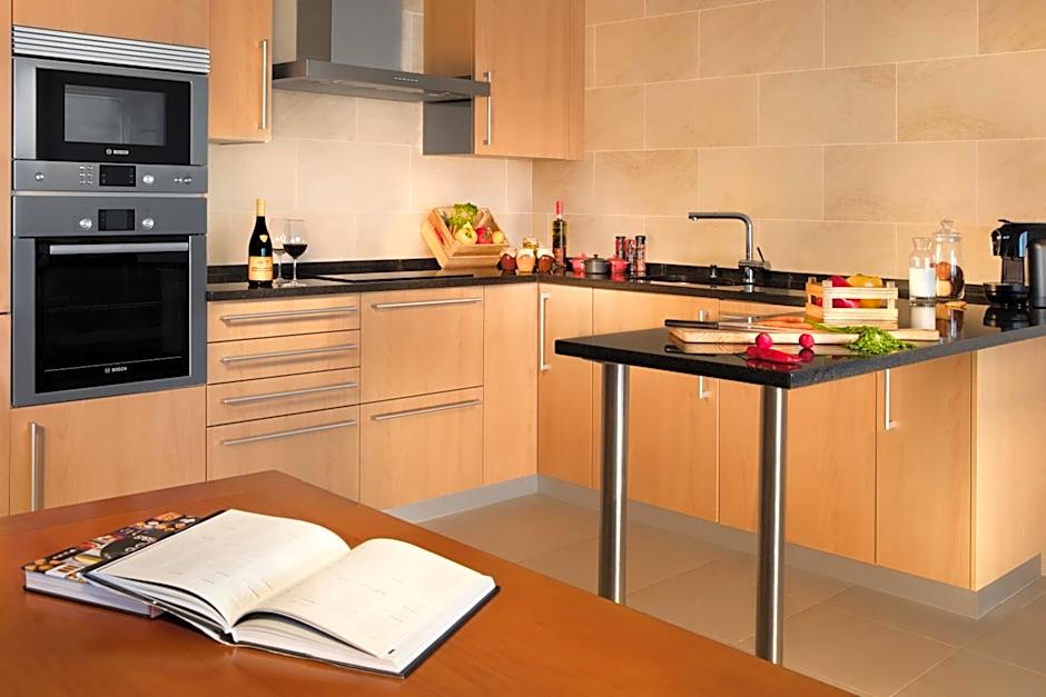 The elegant living room has large windows allowing plenty of daylight and opening to the furnished balcony. It features sofas, a flat-screen satellite TV with DVD player and a dining area. The fully equipped kitchen includes a dishwasher and washing machine. The private bathroom includes free toiletries.